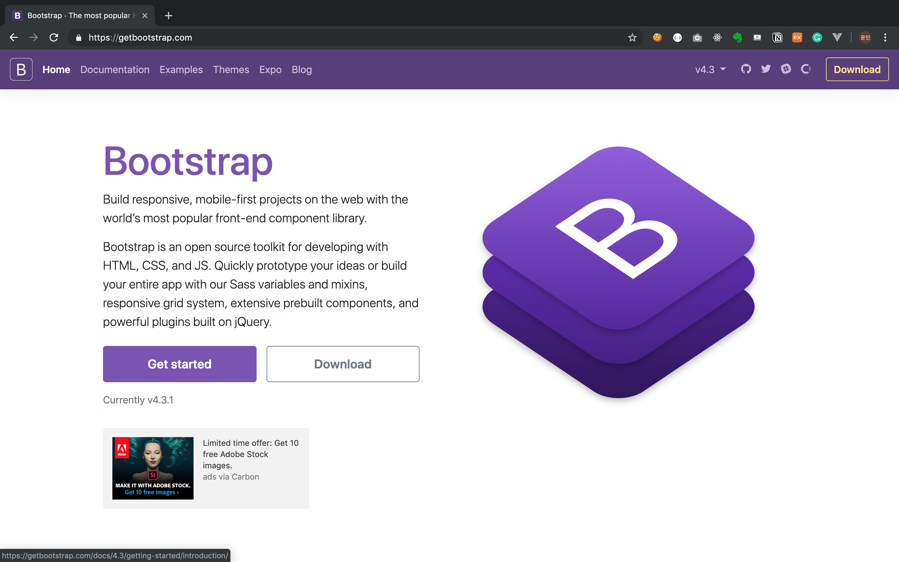 우선은 부트스트랩 공식 사이트에 접속해 메인 페이지에 보이는 'Get stared'를 눌러줍니다.