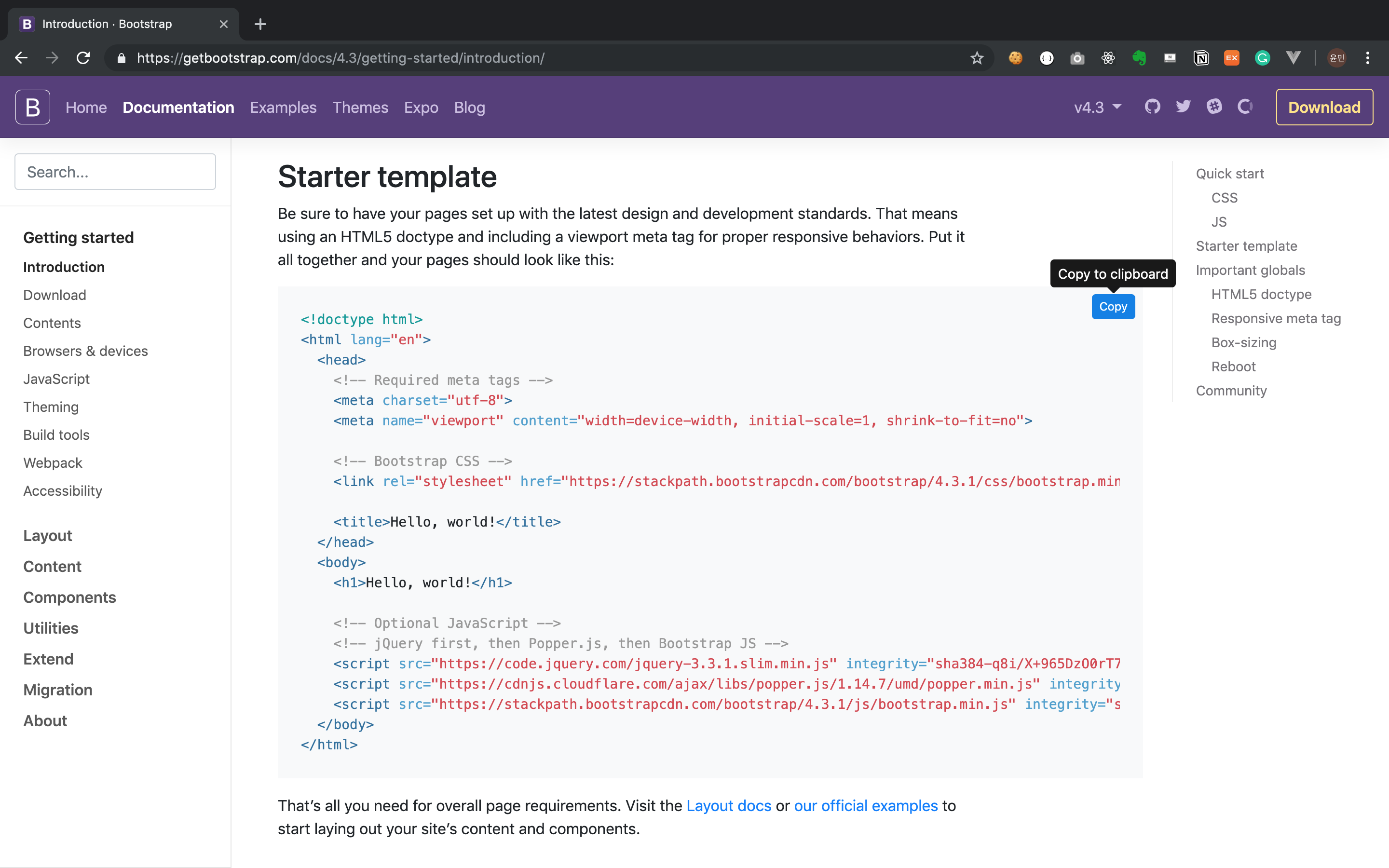 그러면 우리는 'Introduction' 페이지를 볼 수 있습니다. 아래로 스크롤을 하다보면 'Starter template'을 보실 수 있을 겁니다. Starter templae에 있는 코드 전부를 복사해 주세요. 코드 상단 우측에 있는 'copy' 버튼을 눌러주시면 됩니다!