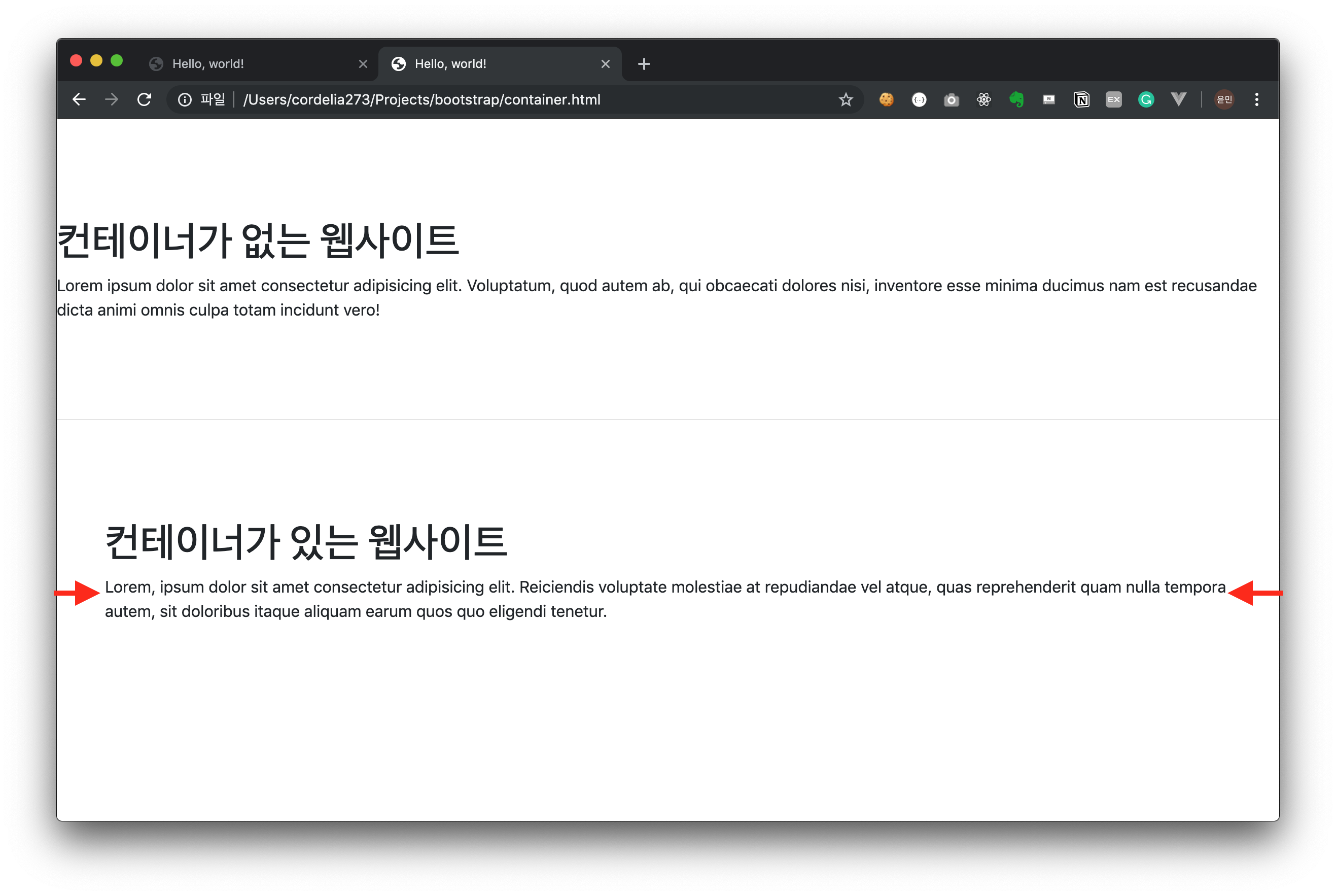 그 대신에 사람들이 조금 더 글을 읽기 편하게 하기 위해 사이트의 양옆에 일정한 공백을 두죠. 그것이 바로 컨테이너입니다. 다음과 같은 차이가 있습니다.