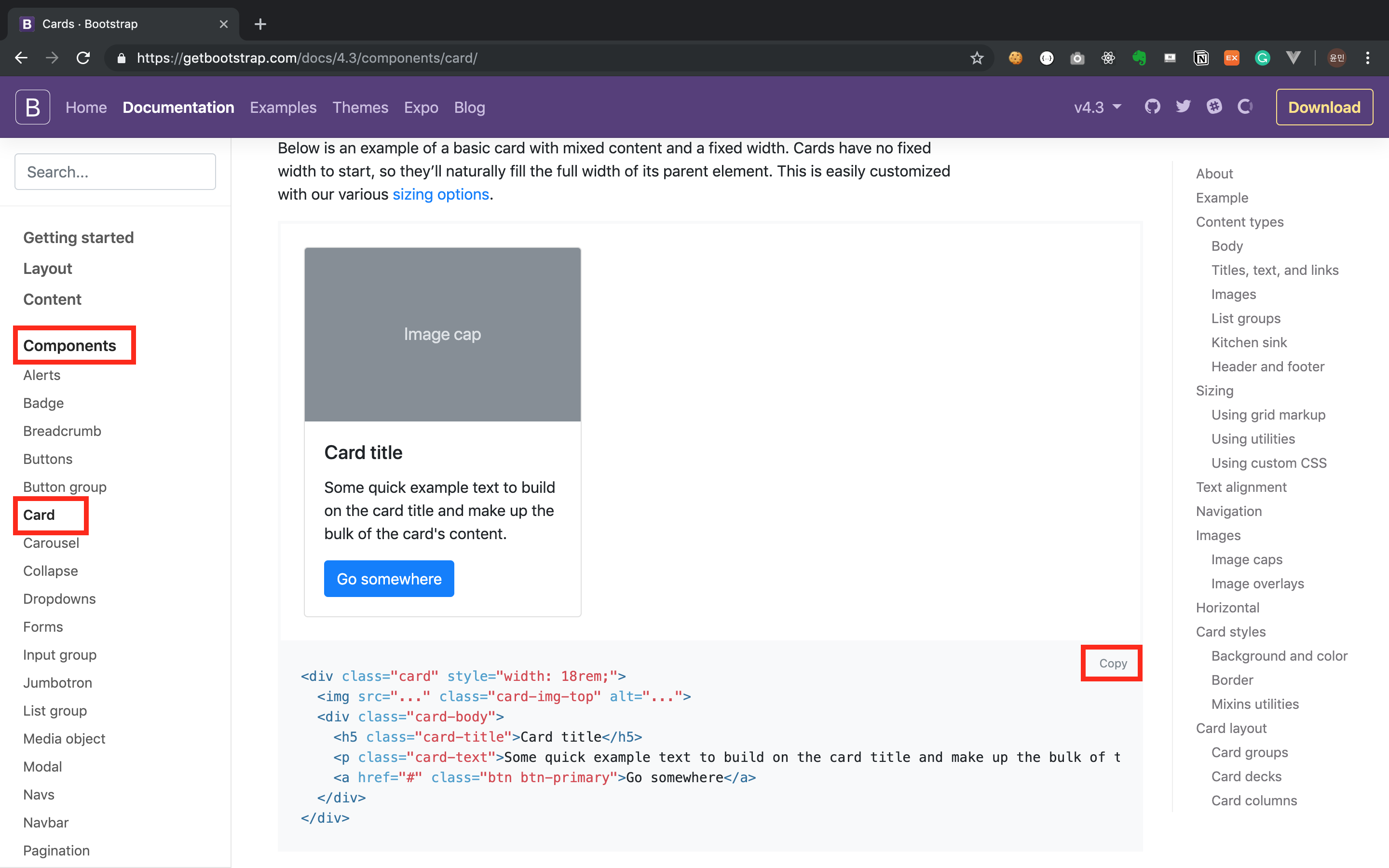 우리가 사용할 수 있는 도구의 목록들은 부트스트랩 공식 사이트의 'Document'에서 확인할 수 있습니다. 우리는 그 중에서도 'Components' 탭에 있는 도구들을 먼저 살펴보겠습니다.