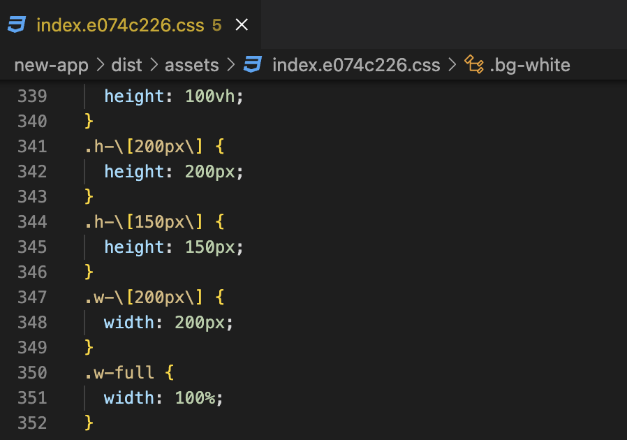 위의 코드와 같이 대괄호 안에 값을 직접 넣으면 테일윈드가 해당 값을 가지는 속성을 자동으로 css로 변환해 빌드합니다. 실제로 빌드된 결과를 보면 다음과 같은 코드들이 자동으로 추가되어 있는 것을 볼 수 있습니다!