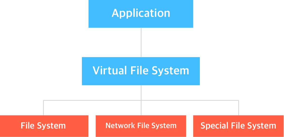 가상 파일 시스템을 이용하면 물리적인 파일 시스템 이외에도 다양한 파일 시스템에 같은 방식으로 접근할 수 있다. 아래의 그림에서 볼 수 있듯이 'Network File System'이나 이후 설명할 'Special File System'이 그 예시이다.