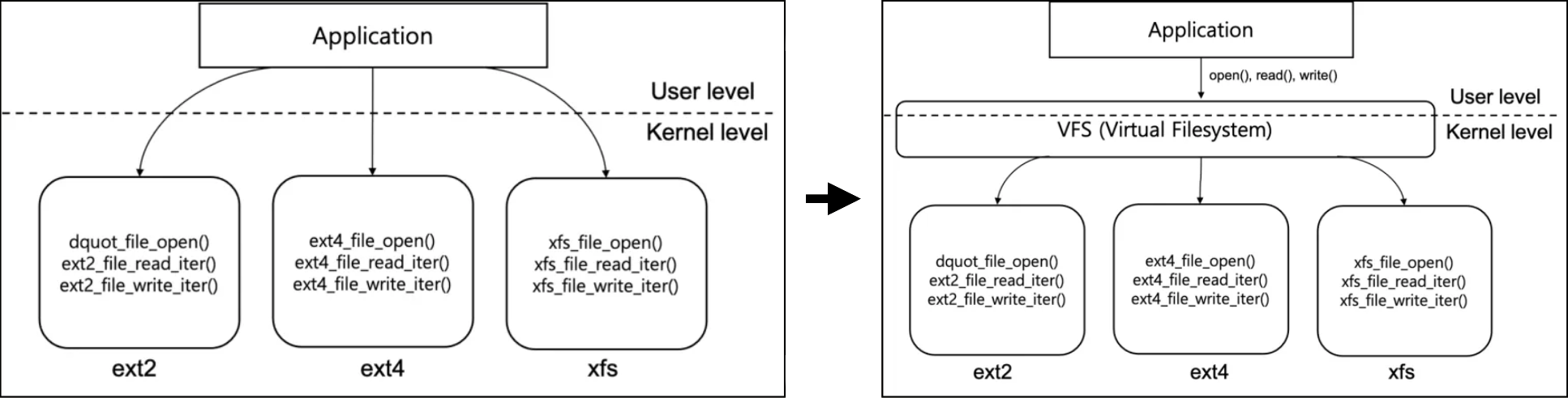 파일 시스템 마다 다른 방식으로 디스크를 관리하기 때문에 각 디스크 마다 다른 명령어를 사용해 접근해야 한다. 그렇게 되면 응용프로그램을 개발하는 개발자가 각각의 포맷에 따라 파일을 읽고 쓰는 함수들을 일일이 구현해 주어야 한다. 그리고 개발자가 구현하지 않은 포맷의 디스크에서는 데이터를 불러올 수 없을 것이다.