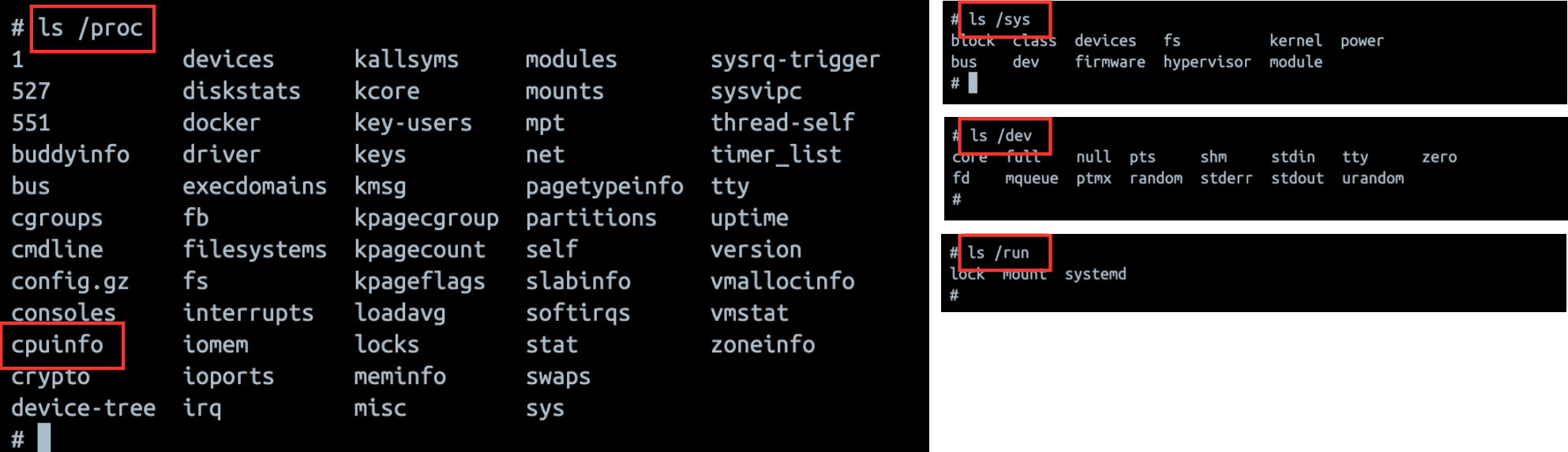 Special File들은 운영체제가 시작되면 메모리 공간에 올라가 있다가, 사용자가 해당 파일을 조회하면 그때 값을 계산하여 사용자에게 보여준다. Special File들을 기본적으로 파일과 같이 관리되기 때문에 일반적인 폴더를 탐색하는 것과 같은 명령어를 사용할 수 있다.
